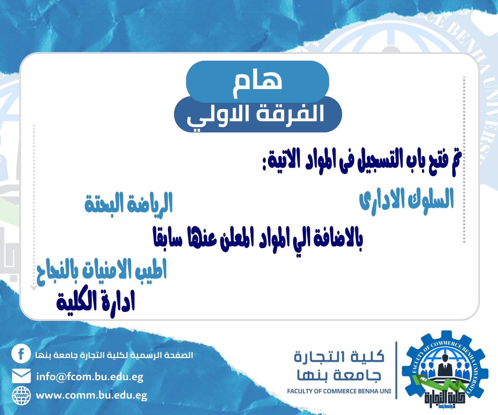 تم فتح باب التسجيل لطلاب الفرقة الاولى نظام الساعات المعتمدة بالترم الصيفى للعام الجامعى 2022/2023 م يوم 2023/7/12 م فى المواد الآتية :